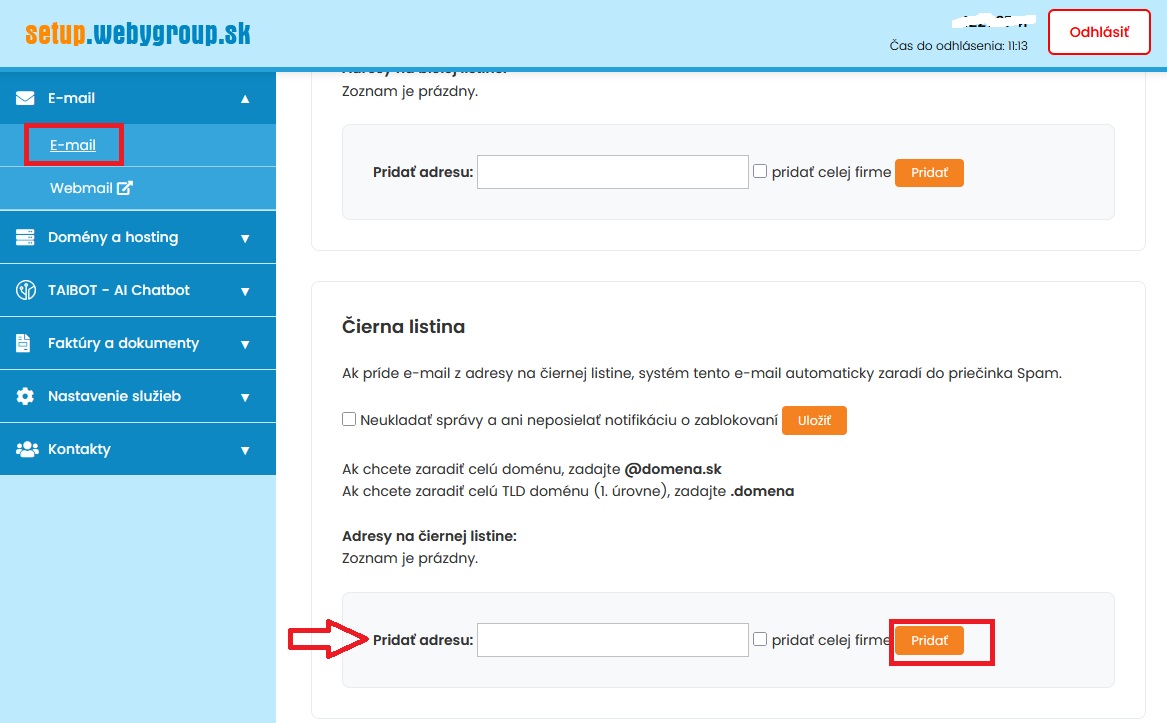 Ak klientovi predsa len prišla do mailu spamová pošta, môže adresáta tohto spamu vložiť na čiernu listinu spamovej ochrany. Čierna listina je tiež k dispozícií vo virtuálnej kancelárii.