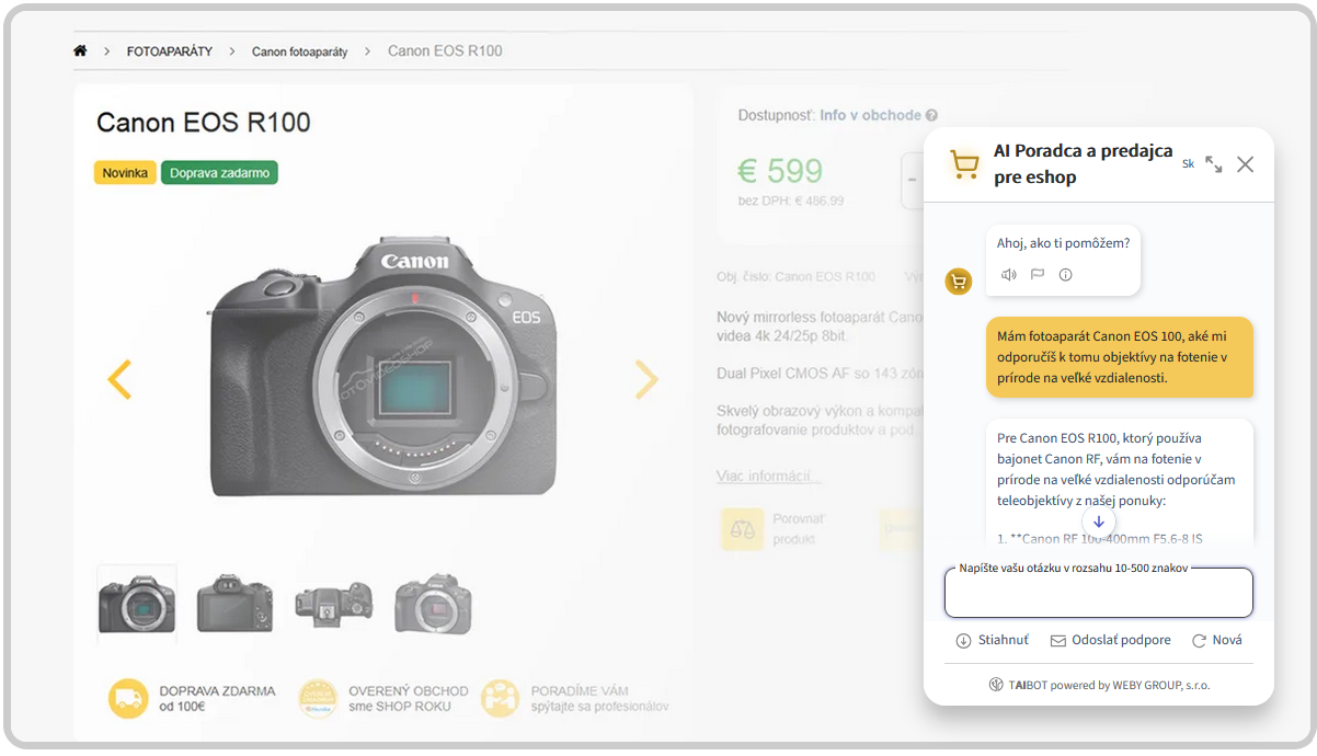 AI trend nejde zastaviť, ale dá sa využiť vo váš prospech. Vďaka najnovšej aktualizácii vo WebyGroup môžete získať vlastného AI chatbota TAIBOTA. Môže byť aplikovaný na akýkoľvek web, alebo eshop, nielen v systéme UNIobchod / UNIsite. A pomôže vám predávať, odpovedať zákazníkom a posunúť váš e-shop, alebo web do vyššej ligy.